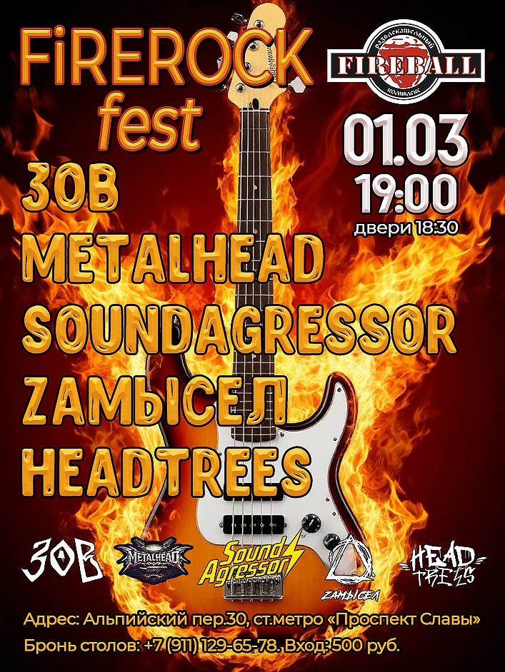 Fireball Альпийский переулок, д. 30, Санкт-Петербург, Российская Федерацияфестиваль тяжелого рока "Firerock Fest" Пять убойных команд, хотят отметить первый день грядущей весны зажигательным шоу на сцене клуба Fireball! Свежая волна гитарного рока от Headtrees, кавер версии нетленок техасских рейнджеров ZZTop от SoundAgressor, группа Зов продемонстрирует классический трэш метал, сочетание мелодики и драйва от новгородских парней Metalhead, ну и группа Zамысел накроет все это […]