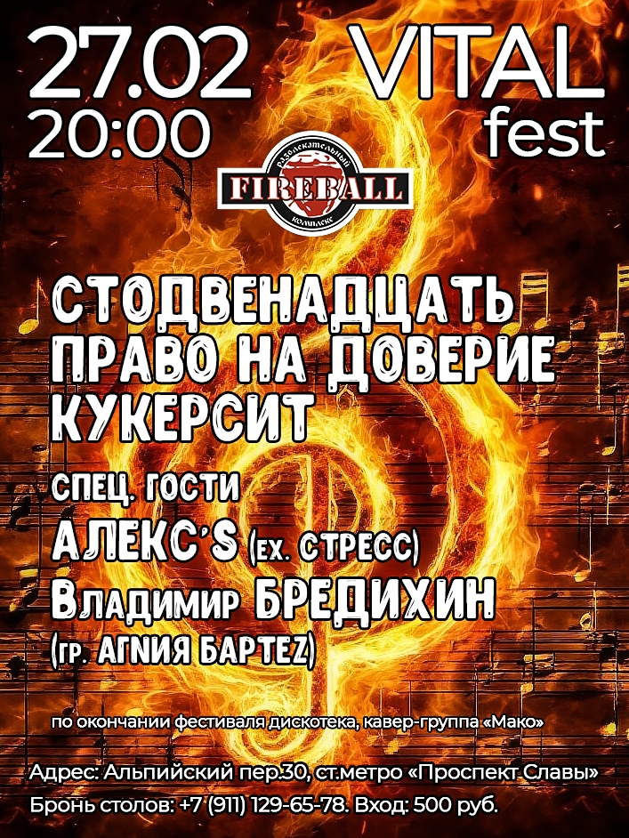 музыкальный фестиваль "VITALfest" Друзья! Приглашаем всех Вас на фестиваль "VITALfest" в клуб «Fireball»!!! Отличная музыка, драйв, хорошее настроение и незабываемые эмоции ждут вас в этот вечер. На сцене выступят Специальные гости: Владимир Бредихин (лидер группы АГNИЯ БАРТЕZ) - музыкант, композитор, участник и организатор многих фестивалей. Его песни знают не только в Санкт-Петербурге, но и в […] |