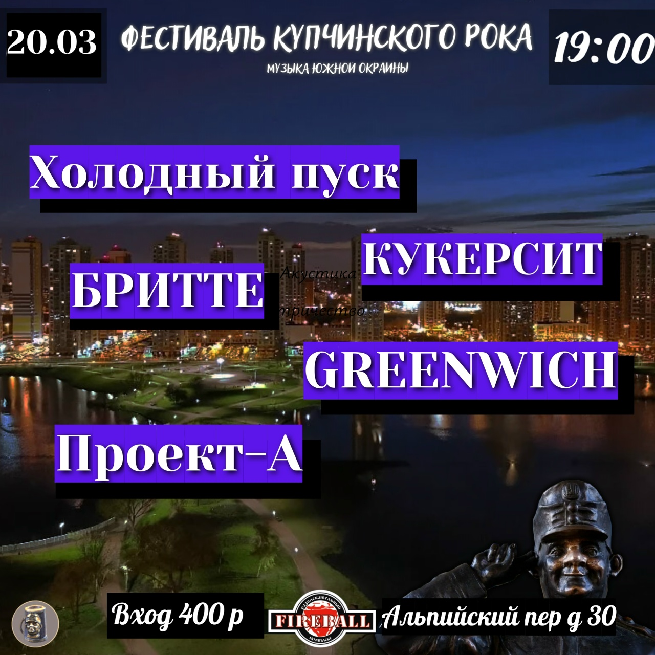 ФЕСТИВАЛЬ КУПЧИНСКОГО РОКА приглашает гостей на большой электрический концерт в клуб FIREBALL 20 марта Для Вас будут сотрясать планету своими песнями отличные музыканты из нашего города и не только Холодный пуск Кукерсит Бритте Проект-А Окуловка Greenwich Великий Новгород Все подробности будут тут vk.com/event223823400 |